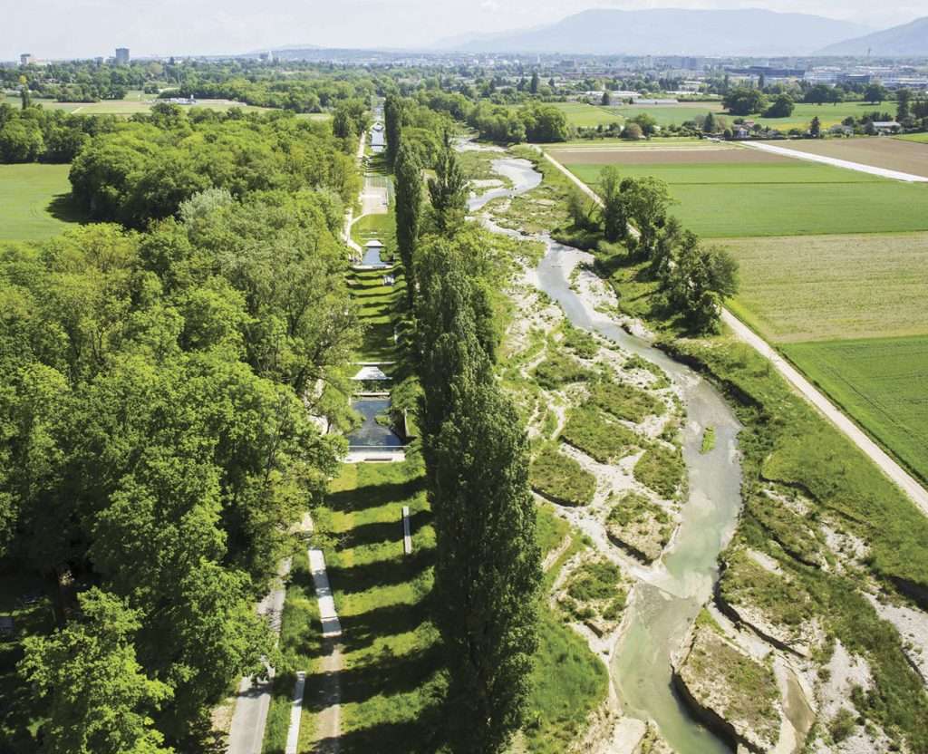 L’immagine mostra il progetto di rinaturazione del fiume Aire, vicino Ginevra, Svizzera. Il progetto ha trasformato un canale artificiale in un paesaggio fluviale dinamico. L’idea era quella di restituire spazio all’acqua, garantendo protezione dalle piene e creando un habitat prezioso per la biodiversità